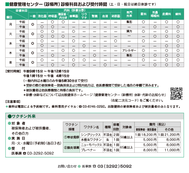 | 歯科 | 月~金 | 初診は電話による予約制となります。予約可能日は電話申込の当日から翌々週金曜日の間です。 (出版健保被保険者および被扶養者のみとなります) |